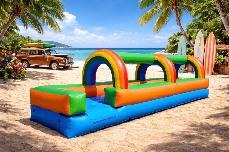 Stretching 25 feet of bright, bouncy fun, the 25’ Rainbow Splash Slip n Slide is a colorful, inflatable water lane built for high-energy backyard play. Vivid rainbow arches span the length of the slide, creating an eye-catching tunnel that helps contain the splash zone while adding a festive look. Wide, cushioned side rails keep sliders safely between the lanes, and the smooth vinyl surface provides a slick ride for running, sliding, and cooling off on hot days. This rental is designed for straightforward setup and active use at parties, family gatherings, or summer events where kids (and bold grown-ups) want an exciting, wet attraction that’s as safe as it is fun.